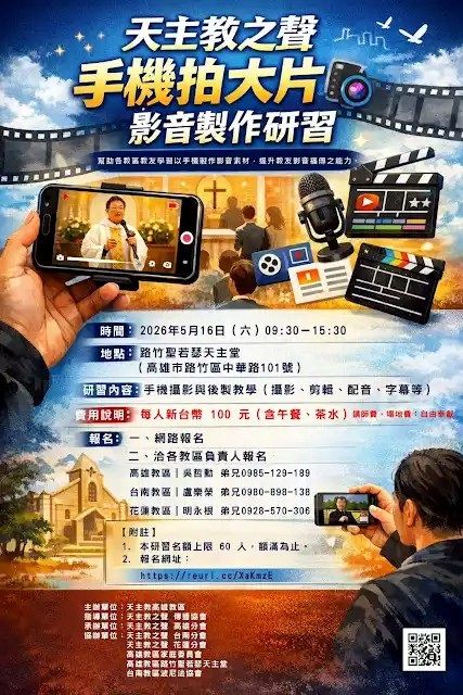 天主教之聲「高雄分會」、「台南分會」、花蓮分會」聯合舉辦【手機拍大片影音製作研習】,自即日起開始報名(如海報)。