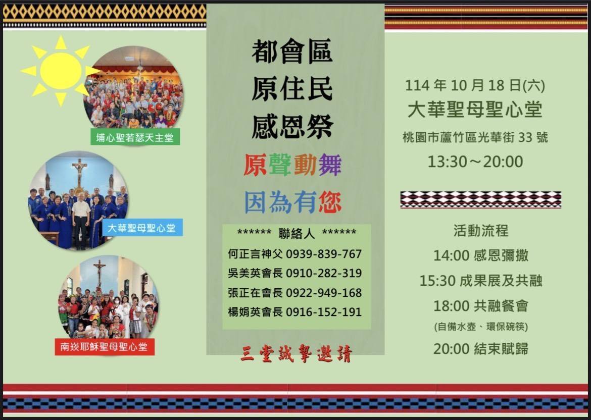 舉辦感恩豐年祭,邀請各界貴賓,及各堂區的神長暨教友們,不分族群,原漢共融,